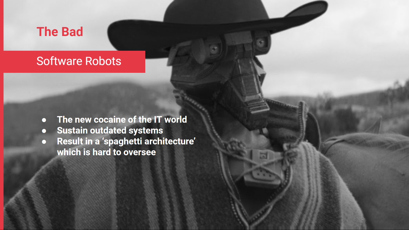 The trend of Robotic Process Automation (or RPA) is a dubious one as well. These tools substitute for the human administration of transferring data across incompatible IT systems. Practically they are abel to copy entries from one screen to another, offering a quick and superficial solution for system integration. The issues is, if we continue to resort to them we get stuck in legacy insurance systems and will not design IT which is future-proof. "Software robots are the cocaine of the IT world", offered Sándor Székely.